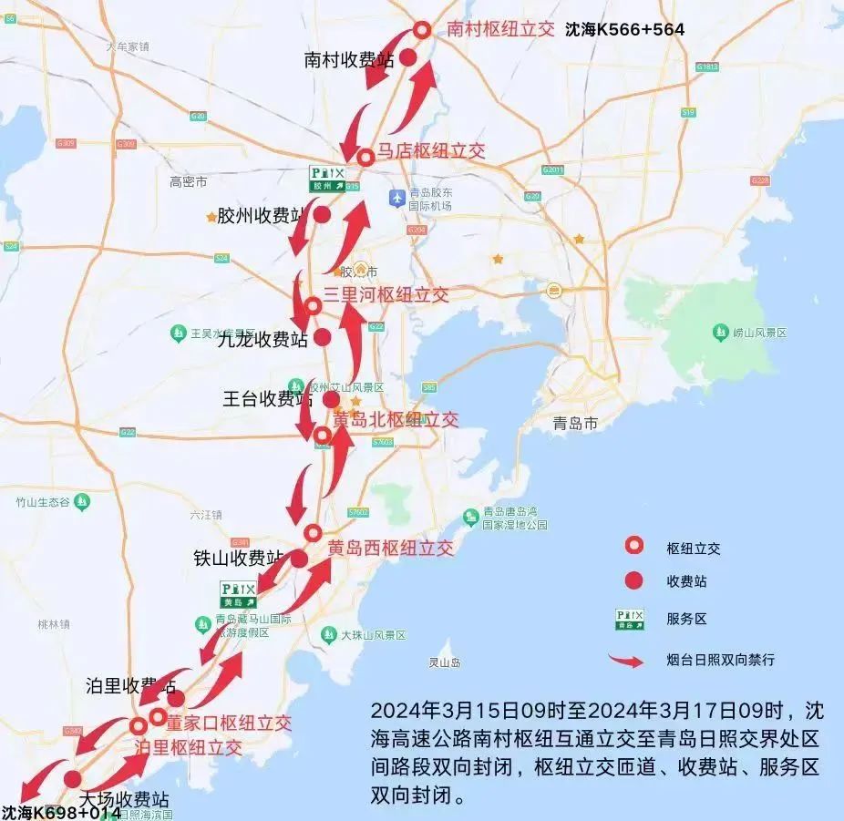 3、马店枢纽立交(G20青银高速公路)、三里河枢纽立交(S24青商高速公路)、黄岛北枢纽立交(G22青兰高速公路)、黄岛西枢纽立交(S7602疏港2号高速公路)、董家口枢纽立交(S30董梁高速公路)、泊里枢纽立交(S21明董高速公路)驶往G15沈海高速公路烟台、日照方向车辆无法通行,匝道全部封闭;南村枢纽立交(G2011青新高速公路)驶往日照方向匝道封闭。