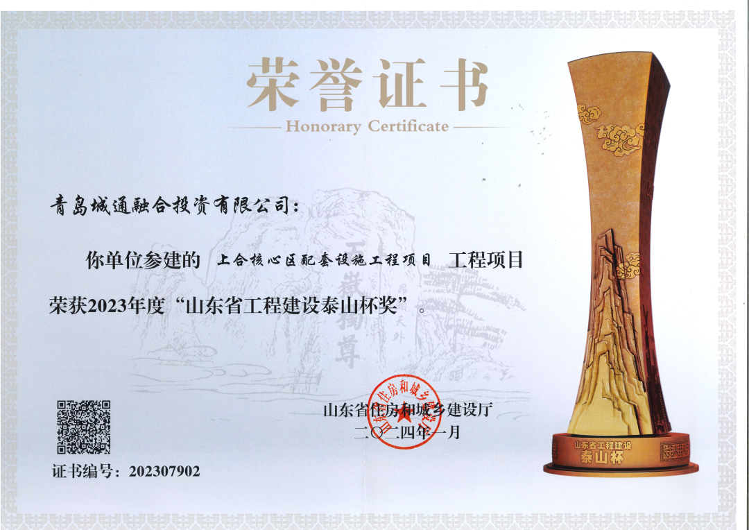 5月10日,山东省住房和城乡建设厅正式授予青岛城投产业园集团参建的上合核心区配套设施工程项目“2023年山东省工程建设泰山杯”荣誉,该荣誉是全省全年度建设工程质量领域的最高荣誉。