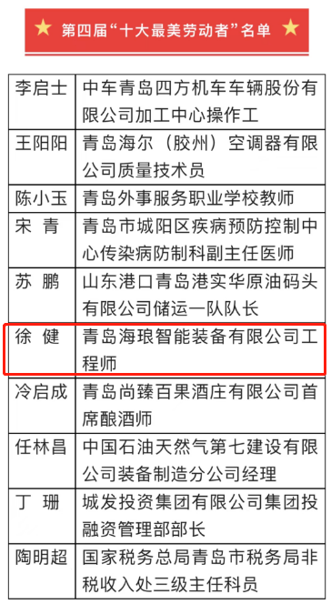 近日,市政府新闻办举办“奋进新征程 建功新时代—2022年青岛市十大最美劳动者”系列媒体见面会。会上公布了青岛市第四届“十大最美劳动者”名单,双星集团海琅智能装备有限公司工程师 徐健 光荣登榜。