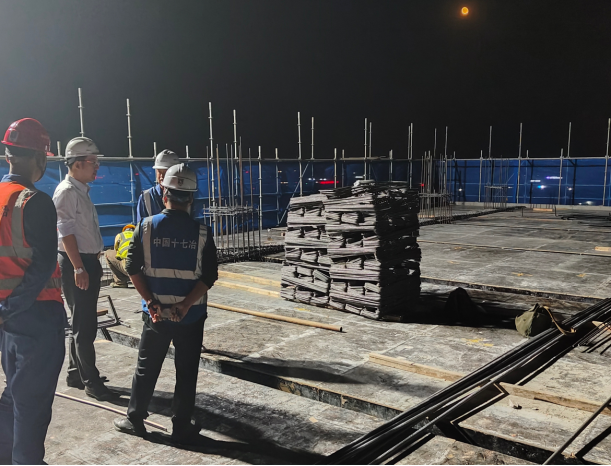 针对目前施工情况,项目团队多措并举增加人员、设备和材料投入,采取工人倒班、机械不停、延长作业时间、多作业面作战、重要节点突击战、科学优化作业工序等有效举措,争分夺秒抢抓工期,确保关键节点不停工、不断档。
