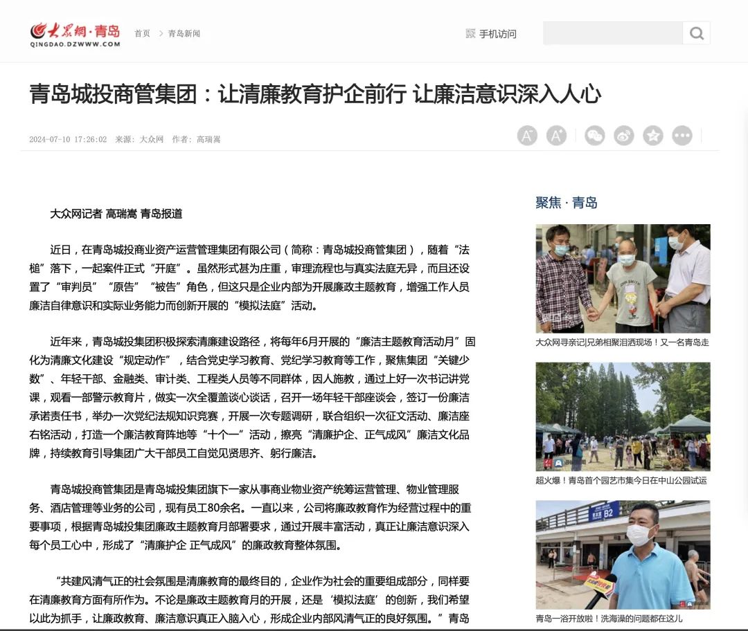 大众网:青岛城投商管集团让清廉教育护企前行 让廉洁意识深入人心