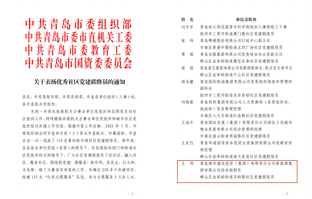 近日,市委组织部、市直机关工委、市委教育工委、市国资委四部门联合行文《开云官方网页版表扬优秀社区党建联络员的通知》对青岛城投新能源集团王帅同志等55名优秀社区党建联络员进行了表彰。2022年以来,城投集团与金家岭街道石岭路社区开展党建结对共建“双报到”,本次表彰再次体现了有关部门对集团党建共建工作的高度评价。
