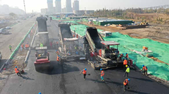 唐河路-安顺路打通工程首段上面层SMA沥青顺利摊铺